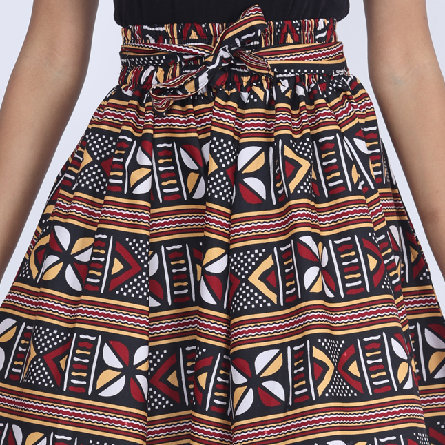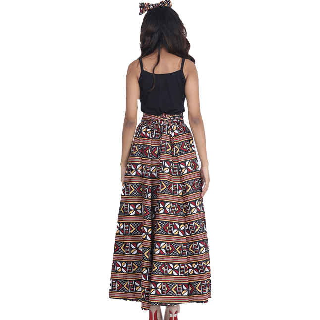 African Print Long Skirt assortment of vivid African prints make it a chic addition to your collection. This floor-length A-line skirt’s adjustable tie belt and elastic waist assure an easy fit. It further provides convenience with two helpful pockets. A matching head wrap completes the ensemble and makes dressing simple. This skirt and wrap are appropriate for a variety of occasions. They may be dressed up for more formal events with heels and a top, or they can be worn simply.
