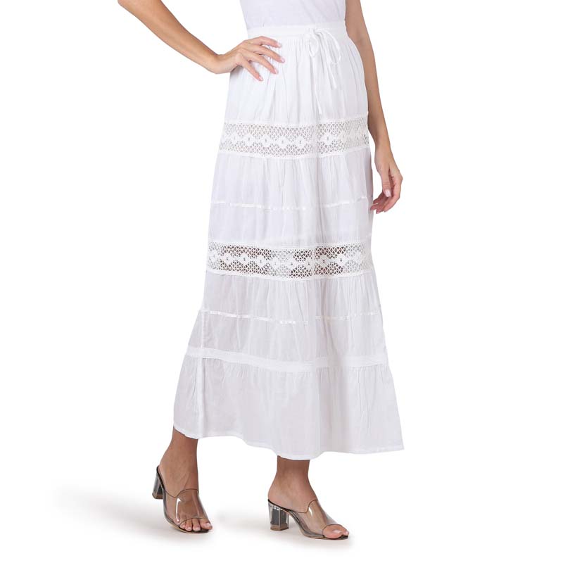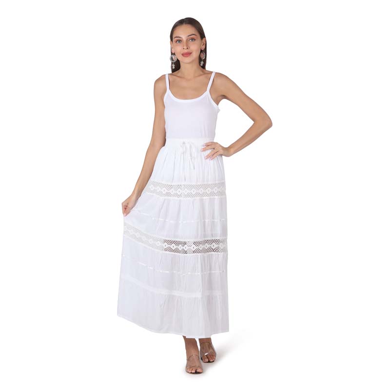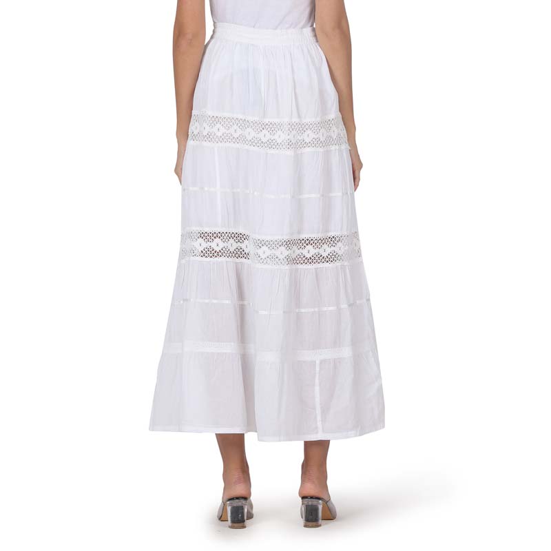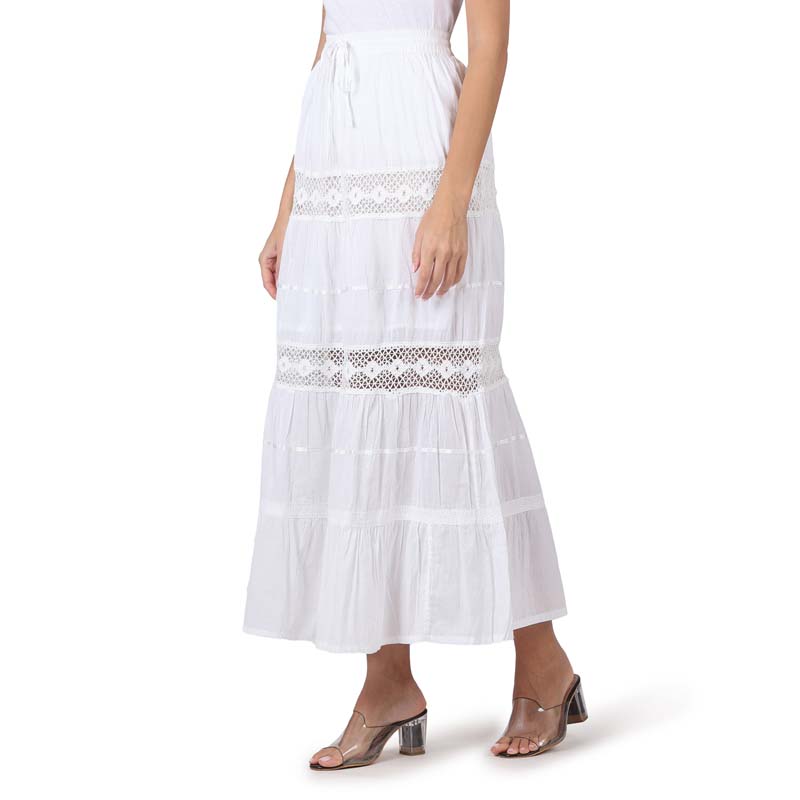 Enjoy extra comfort in this soft and breathable pure-cotton maxi length skirt .Crochet lace,embroidery enhances the beauty of tiered skirt.