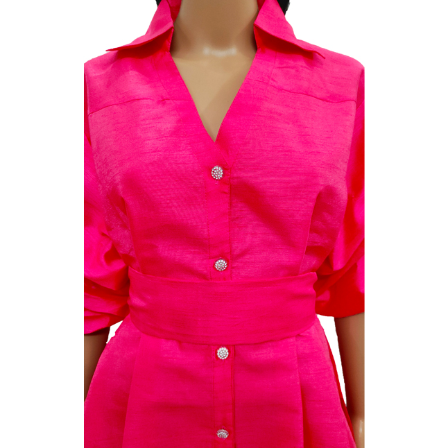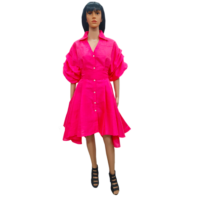 This dress features an open front with gorgeous buttons, ruffled sleeves, and a V-neckline with a collar in the back. A scarf can be worn in a variety of ways, including around the waist. The front is slightly lifted from the front, and the dress additionally has a pair of pockets for keeping convenient daily stuff. The dress has a lovely flair,appropriate for every body type.