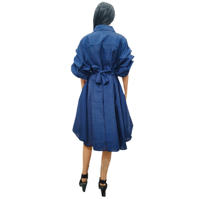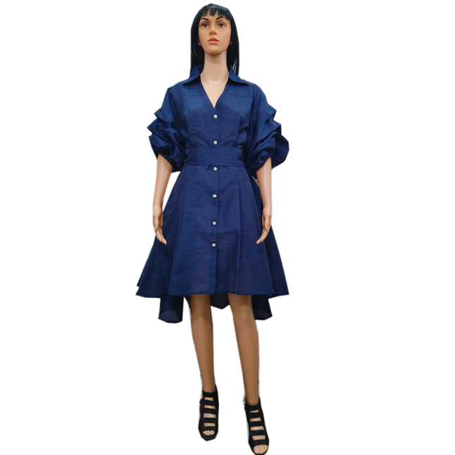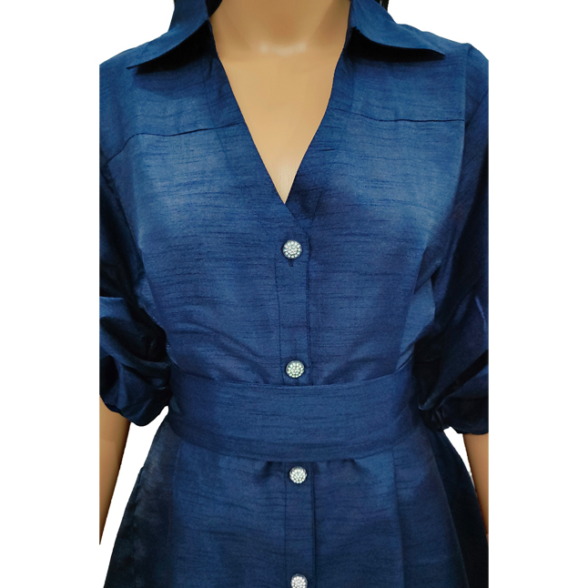 This dress features an open front with gorgeous buttons, ruffled sleeves, and a V-neckline with a collar in the back. A scarf can be worn in a variety of ways, including around the waist. The front is slightly lifted from the front, and the dress additionally has a pair of pockets for keeping convenient daily stuff. The dress has a lovely flair,appropriate for every body type.